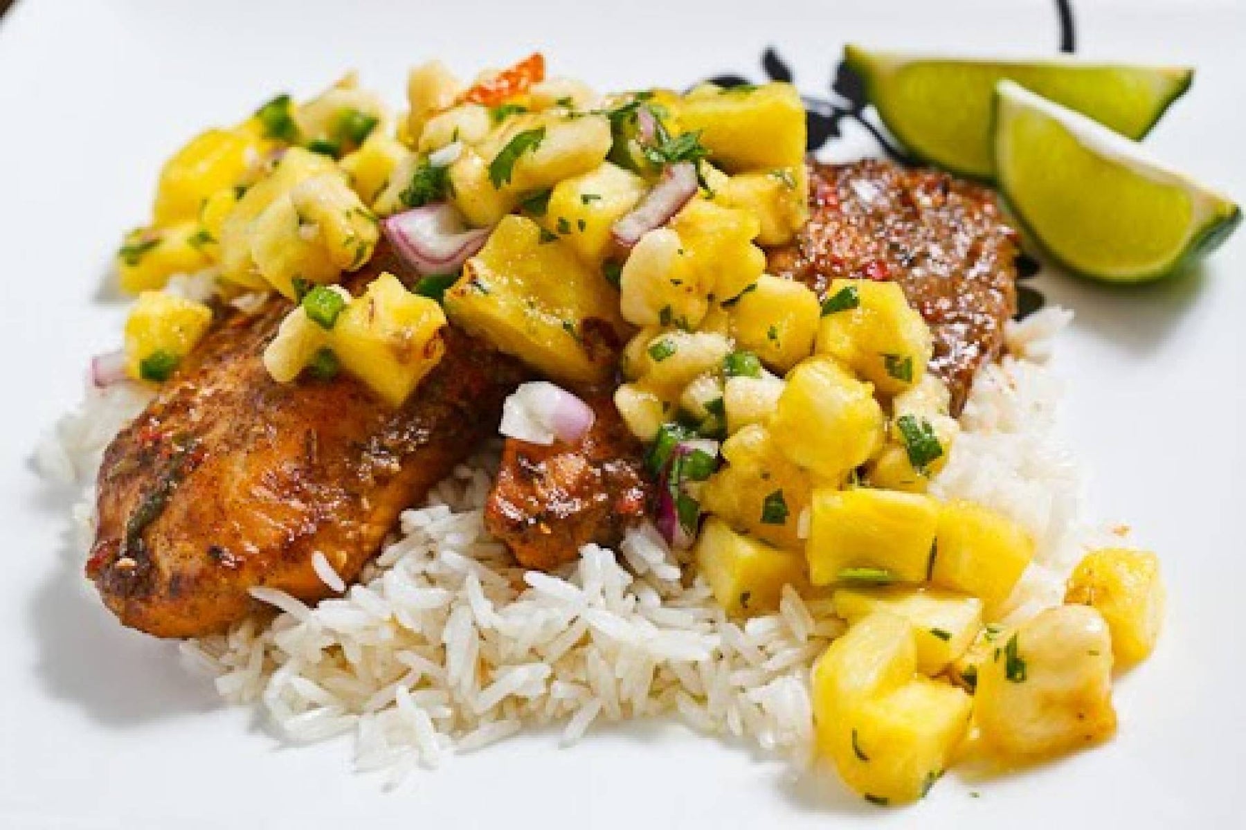 Blackened basa served with refreshing Caribbean salsa over coconut rice.