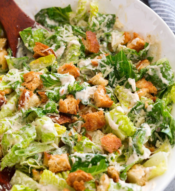 Parmesan, Romain Lettuce, Bacon, Croutons, Mixed Salad Greens, Lemon Wedge, Caesar Dressing.